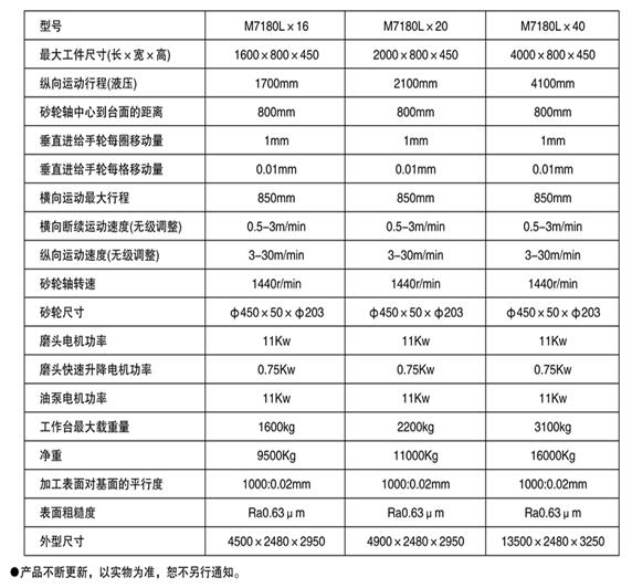 性能及工作特點: 此平面磨床以砂輪周邊或側(cè)面磨削工件的平面,工件可以固定在工作臺上,或吸牢在電磁吸盤上,其材質(zhì)可以是鋼、鑄鐵、石墨、或有色金屬。機床工作臺的左右和磨頭的前后運動都是用液壓驅(qū)動,無極調(diào)速。磨頭的前后運動也可手動操作。磨頭的垂直方向除手動進刀外還配有快速升降機構(gòu),減輕勞動強度提高效率。 主要技術(shù)規(guī)格參數(shù)